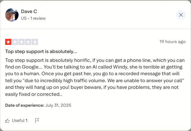Yet, one reviewer, Dave C, shared frustration with Topstep’s phone support system, describing difficulty reaching a human representative and calls ending abruptly due to “high traffic volume.”