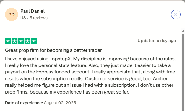 Some traders like Paul Daniel rave about TopstepX, the personal stats dashboard, and rule structure that boosts discipline, plus recent changes that make payouts easier on Express accounts. Free resets on subscription renewals also earned praise.