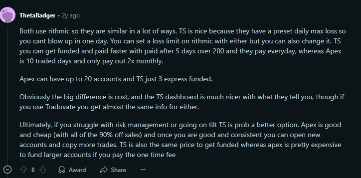 Interestingly, even one trader, @livinglifeonmars, who had earned over $40,000 from Apex and only $3,000 from Topstep still recommended Topstep for its simplicity and smoother overall experience—especially for traders still building consistency.