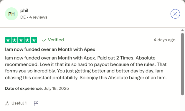 Apex users often highlight the firm’s challenging payout rules as a positive, saying it forces them to become more disciplined and consistent. One trader, funded for over a month, said they’ve already received two payouts and credited Apex’s strict rules for helping them improve day by day.