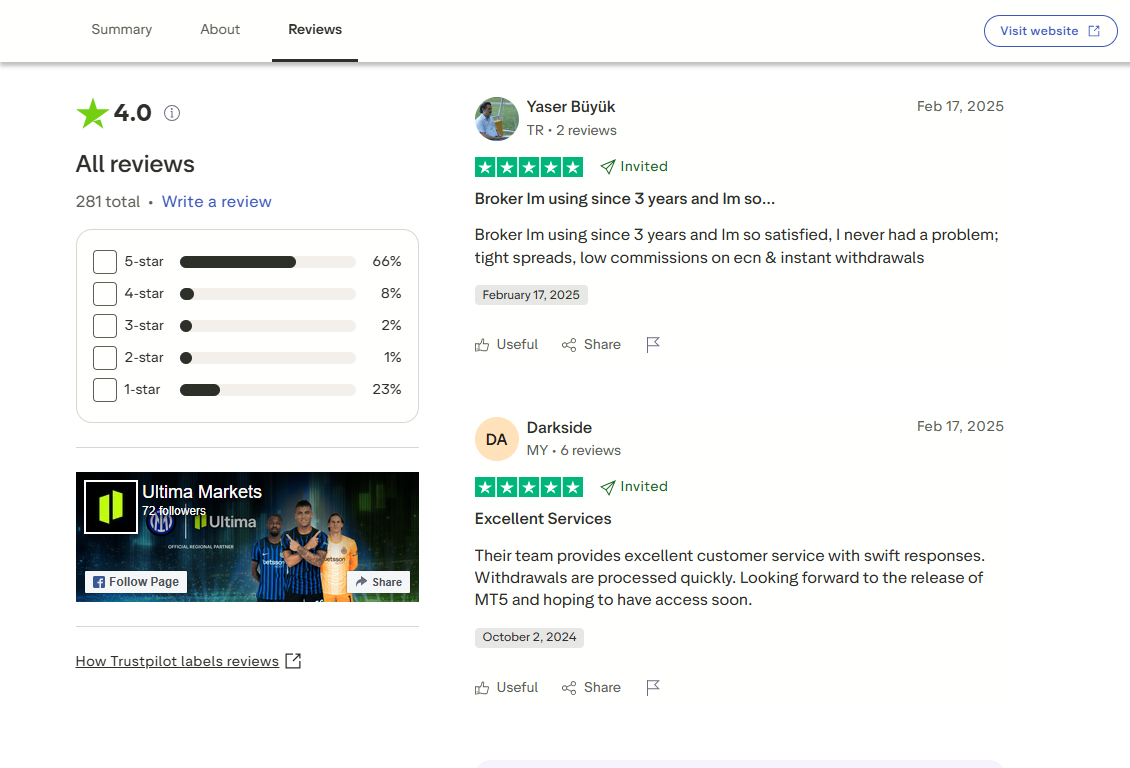 Let me give you the real picture of what actual traders are saying about Ultima Markets on Trustpilot, where they maintain a solid 4.0-star rating. Most legitimate brokers struggle to maintain ratings above 3.5 due to the inherent risks of trading that some users blame on their brokers. This rating suggests Ultima Markets is doing something right in terms of service delivery and client satisfaction.