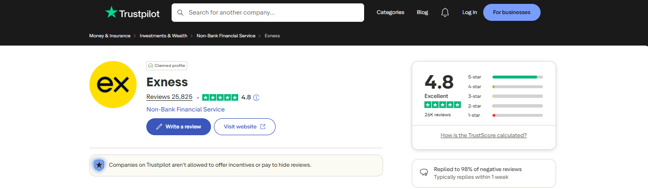 On Trustpilot — one of the world’s most widely used review platforms — Exness currently holds an excellent rating of 4.8 out of 5 stars from over 25,700 reviews.