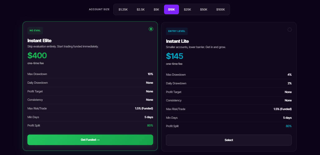 - Account types: Includes instant funding (Instant Lite & Instant Elite)